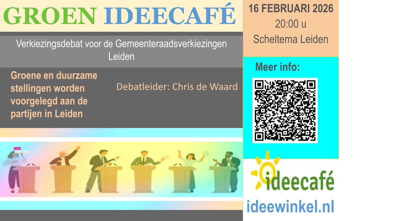 Het Groen Ideecafé is dé ontmoetingsplek voor mensen met vragen, groene, duurzame ideeën en initiatieven in Leiden en de regio. Behalve een ontmoetingsplek is het Ideecafé een inspirerend platform.